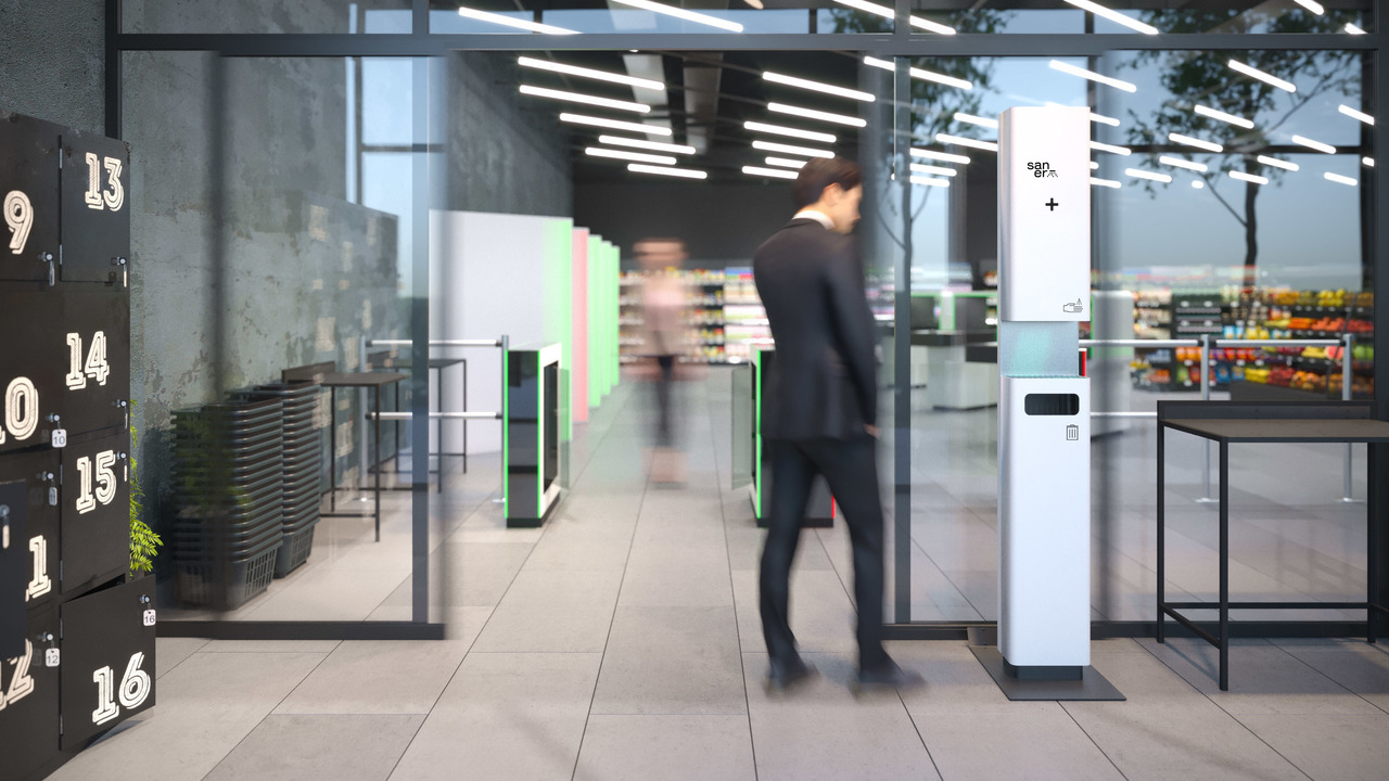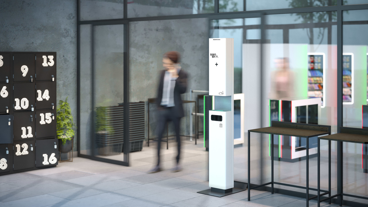 Мобільна станція дезінфекції Saner обладнана сенсорним розпилювачем антисептичної рідини та диспенсером для серветок. Взаємодія є простою та інтуїтивно зрозумілою. Можливі два сценарії користування: власне безконтактна гігієна рук або ж очищення поверхонь за допомогою серветок.
