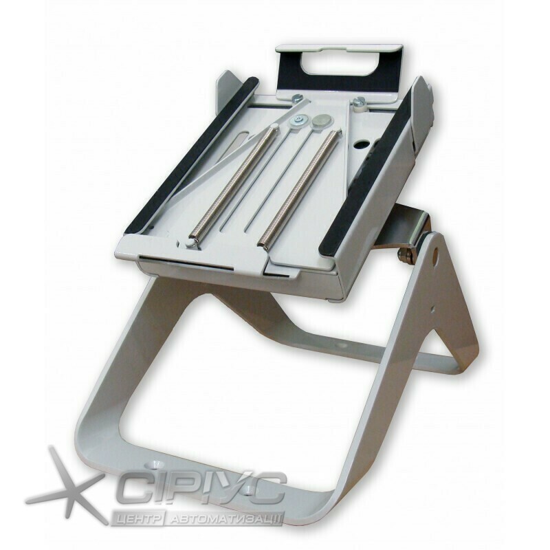 Підставка для планшета виконана з металу і має регульований кут нахилу. Також можливе регулювання під розмір пристрою, поворот тримача і жорстка фіксація підставки до робочої поверхні.