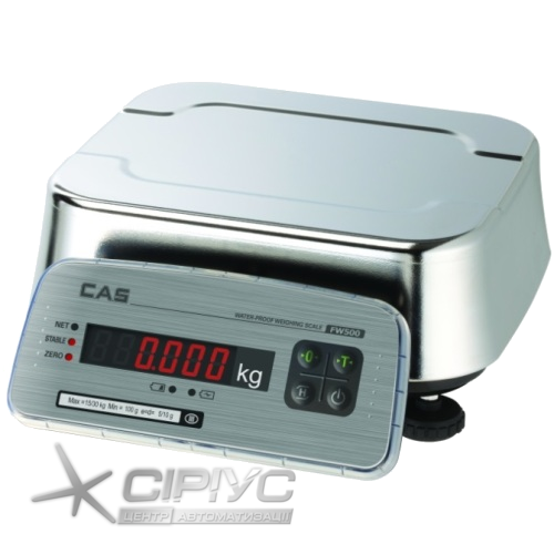 Ваги загального призначення, рівень захисту від пилу і вологи IP68. CAS FW 500 E спеціальні продуктові ваги для зважування заморожених продуктів в торгівлі, для фасування пилоутворюючих продуктів (чай та борошно), в м'ясних цехах, в цехах з переробки риби. Дисплей світлодіодний, яскравий 19 мм. Платформа з нержавіючої сталі, що покриває корпус. Припускається миття ваг під струменем води. Живлення від мережі або акумулятора, адаптер з дротом 5 метров.