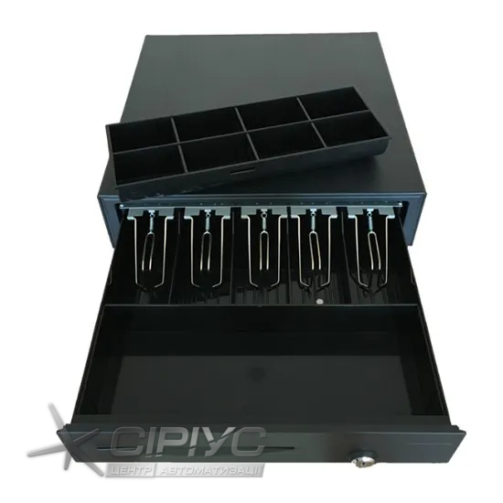 ASAP POS L-410E - класична висувна грошова скриня призначена для зберігання обігових коштів (купюр, монет) і чеків. Грошова скриня має внутрішній пластиковий контейнер, який складається з 8 регульованих відділень для монет і 5 для банкнот, а також оснащена спеціальними металевими тримачами для купюр.