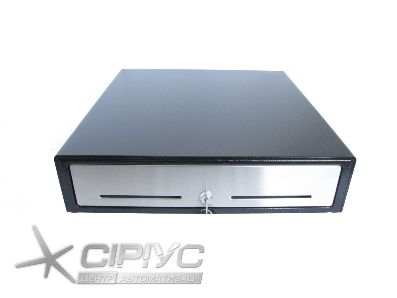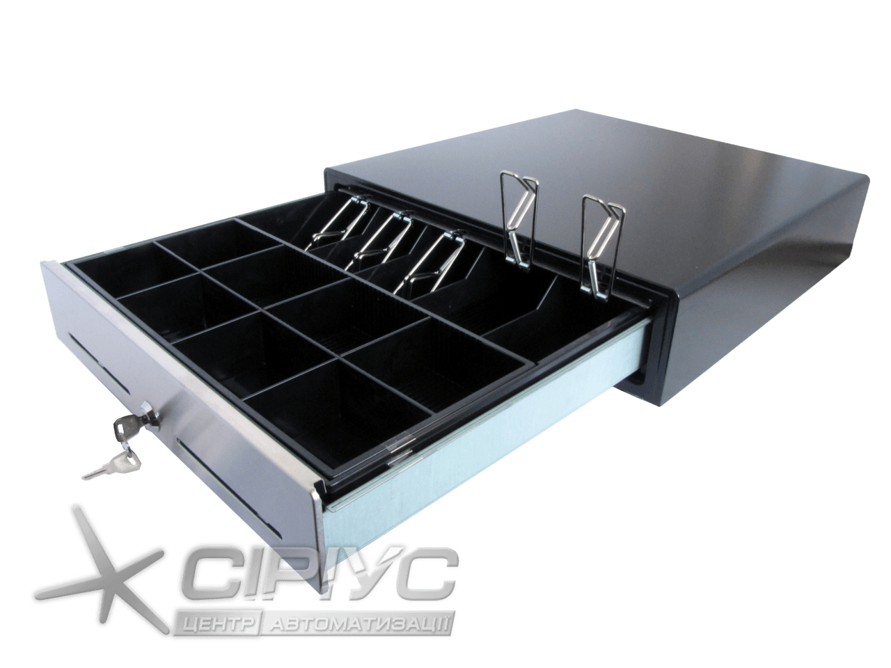 Металевий горизонтальний грошовий ящик латвійського виробництва з п'ятьма секціями для купюр з металевими зажимами, має дев'ять секцій для монет.