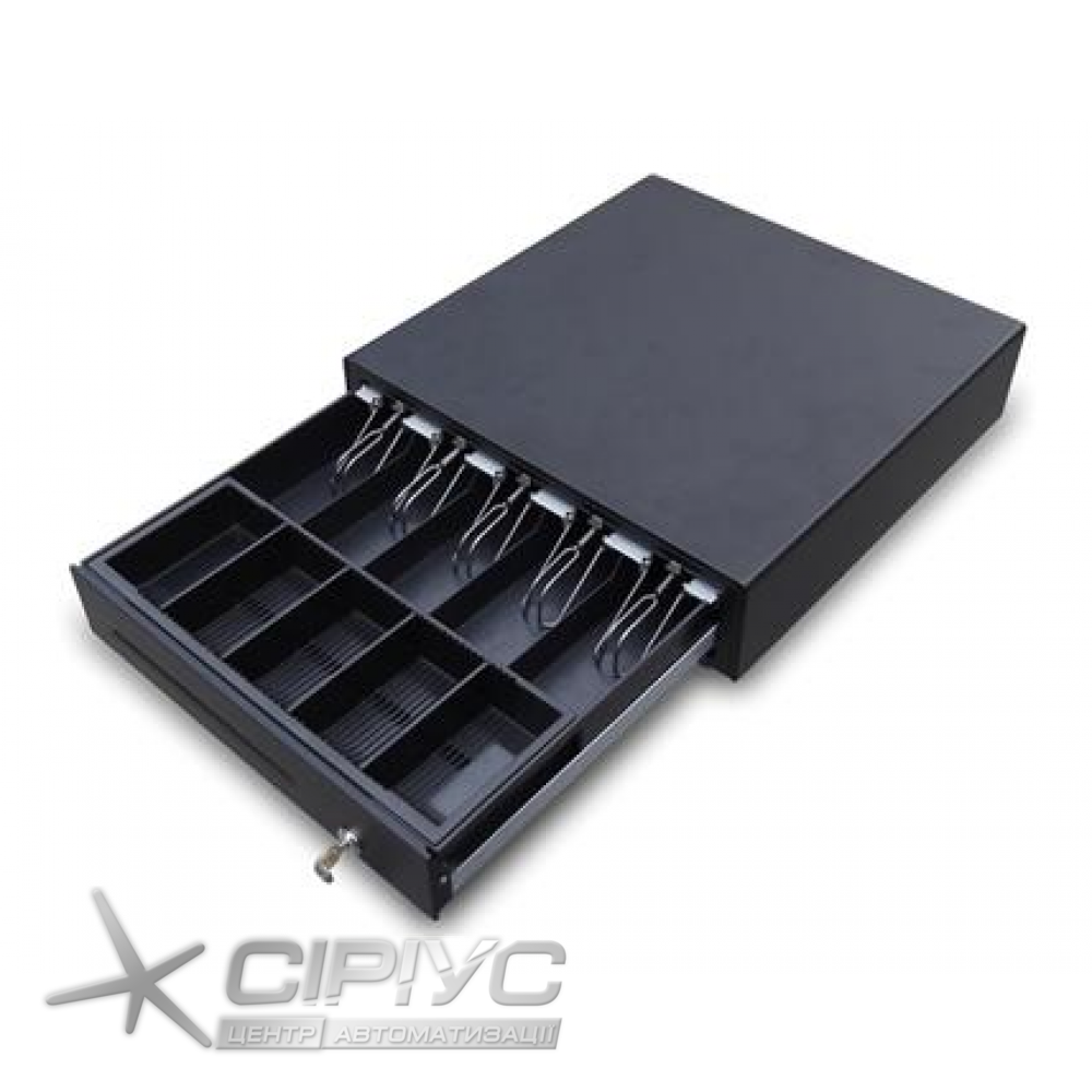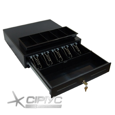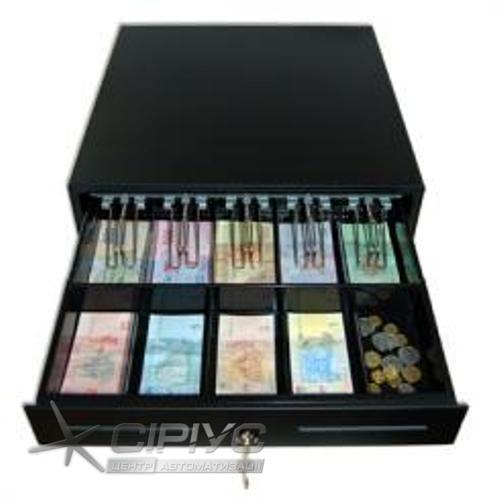 Висувного типу. Регульовані 5 відділів для монет і 5 для купюр з металевими затискачами, трипозиційний замок з ключами 10-ти варіантів. Дві прорізі на передній кришці, прихований відділ для документів А5. Розміри: 460х465х100 (ШхГхВ). Інтерфейс RJ12. Колір чорний. Соленоїд 24В. Вага: нетто 9,2 кг.