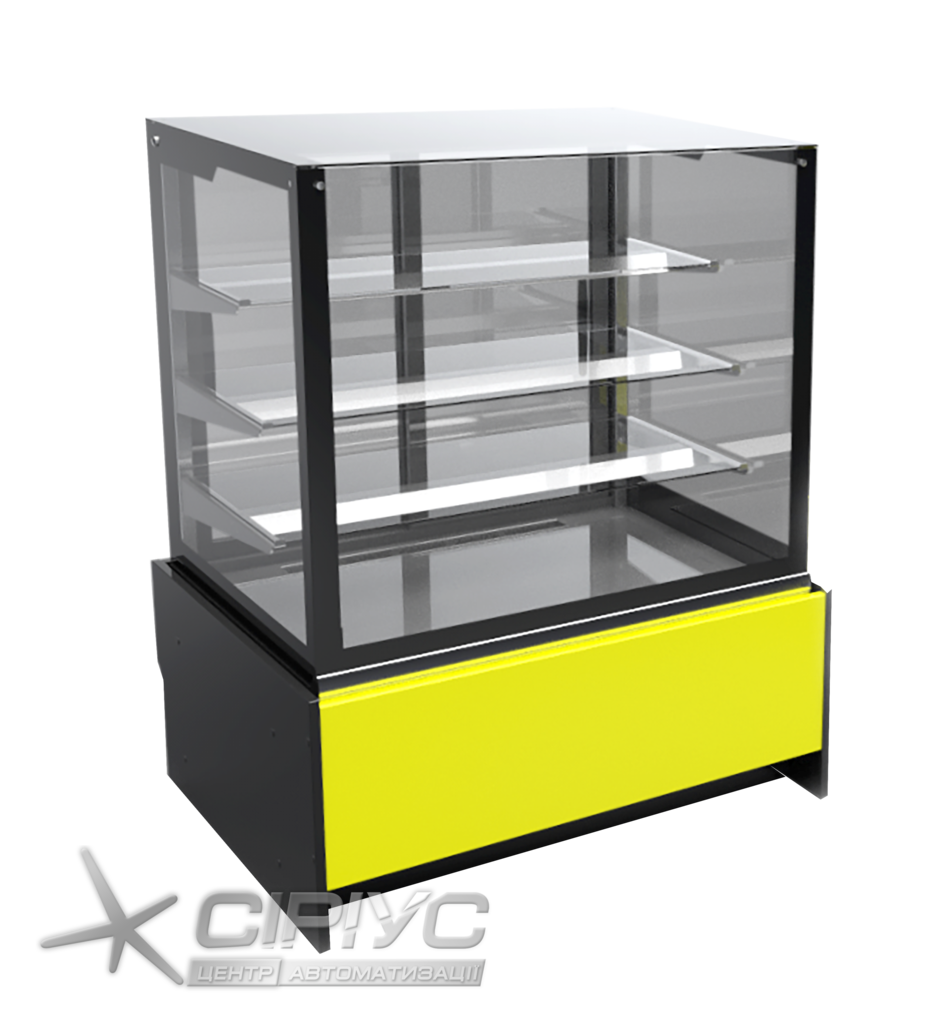 Для товару у вітрині передбачено три скляні полиці та нижній піддон. Ширина полиць складає 47, 43, 38 см. Загальна площа експозиції товарів - 1,66 м2. Температурний режим вітрини холодильної кондитерської від +6 до +12 °С. Тип охолодження в камері динамічний. Використовується автоматичне розморожування.