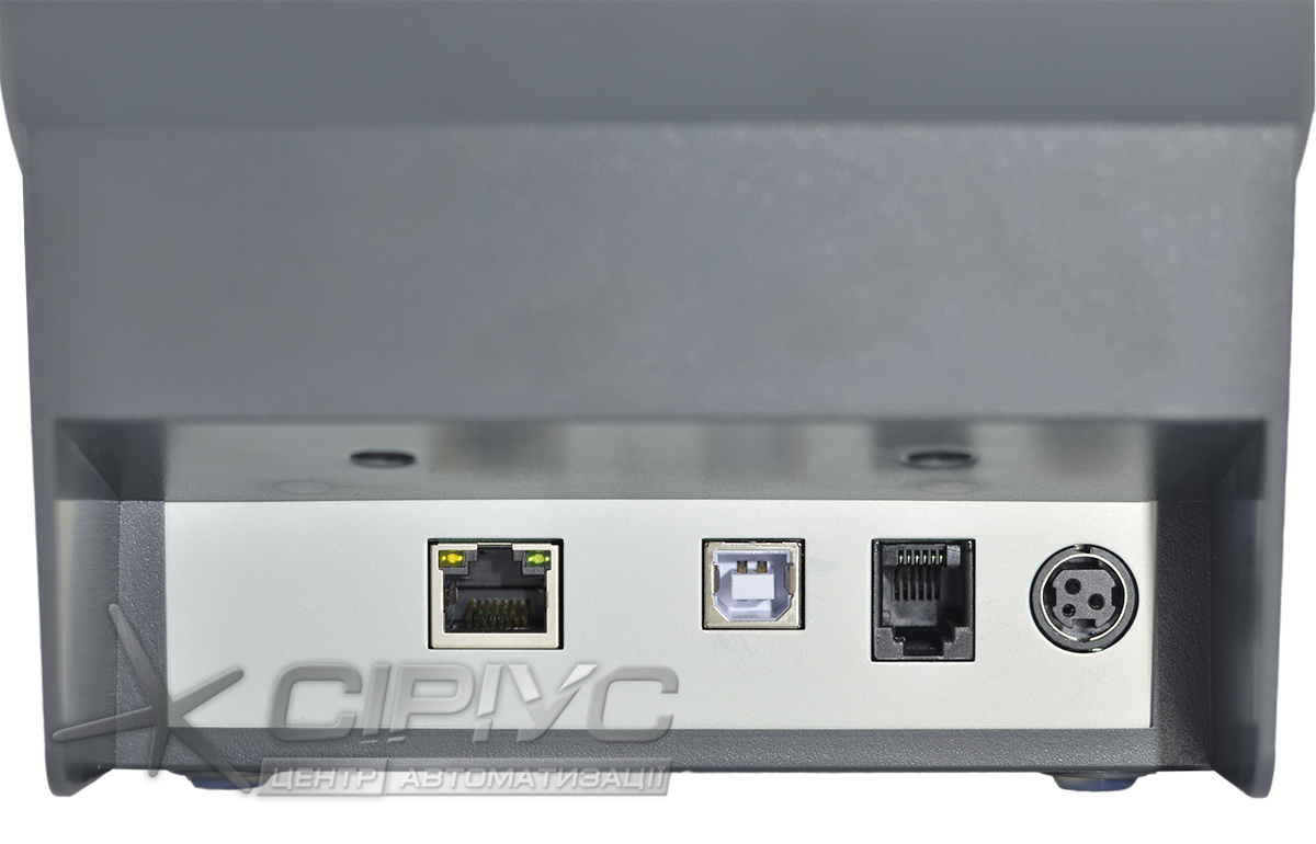 Принтер укомплектований типовими інтерфейсами передачі даних: USB, Ethernet, а також має порт для підключення грошової скрині, 24Вт. Оснащений такими функціями, як: