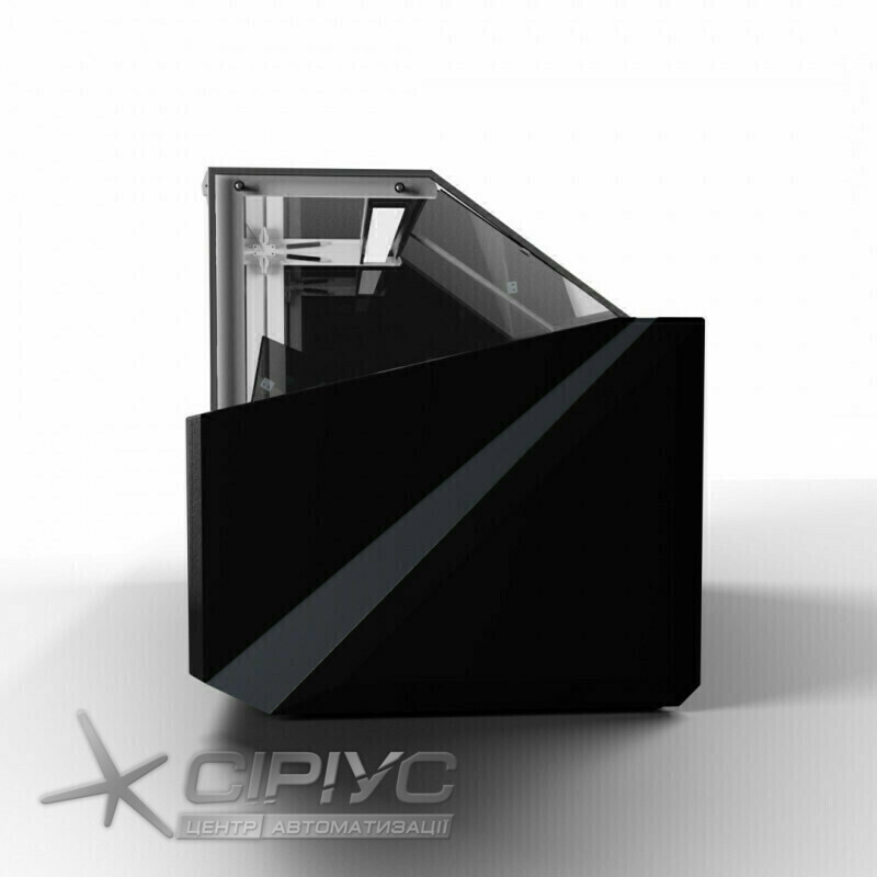 Особливістю цієї вітрини є стильний дизайн, який розроблений для магазинів середнього і преміум сегменту. Вітрина оснащена динамічною системою охолодження, завдяки якій всі продукти охолоджуються рівномірно. Фронтальне гартоване скло має додатковий обдув, бічне скло виготовлене зі склопакетів. Полкиця продавця і демонстраційна частина виготовлені з нержавіючої сталі. Вітрина оснащена енергозберігаючої LED-підсвіткою (відтінок нейтральний білий). Є система підйому фронтального скла за допомогою газліфта, завдяки цьому доглядати за вітриною легко. Є місткий бокс для зберігання продуктів. Обдув переднього скла.