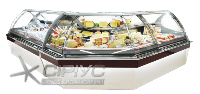 - Виконання подіуму «Елегант-маркет»: вітрина встановлена на овальних стійках з нержавіючої сталі, центральна панель відсутня. Ця опція застосовується для вітрин з централізованим холодопостачанням;