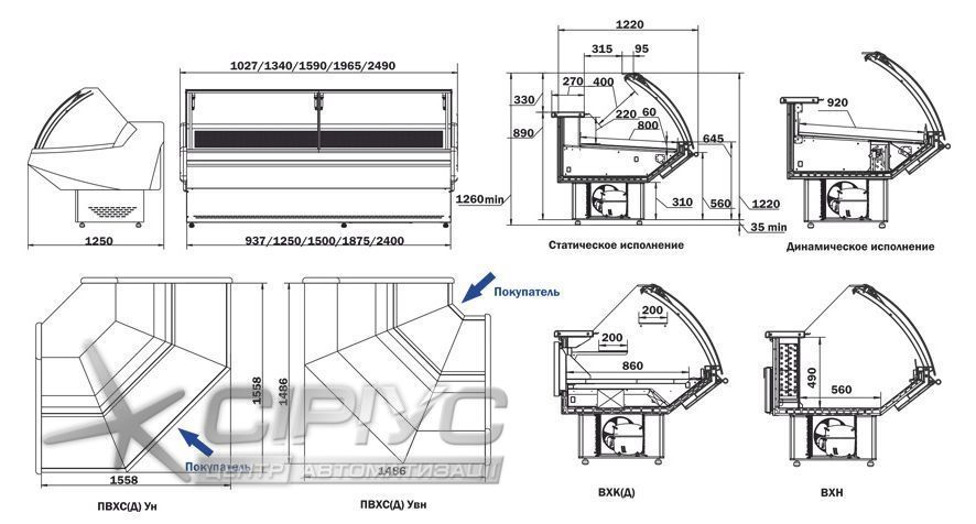 | Модель | Довжина (з боковинами/без), мм | Ширина, мм | Висота, мм | Глибина викладки (статика/динаміка), мм |