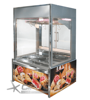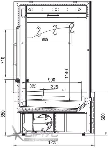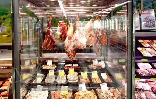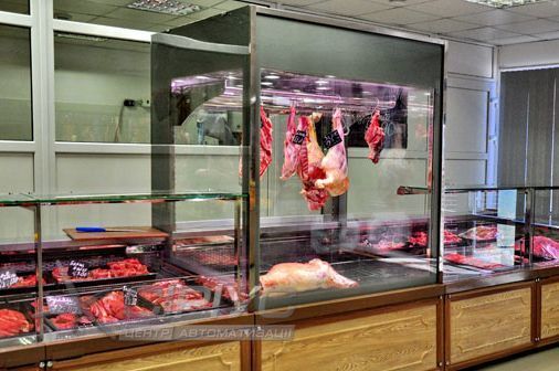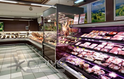 Вертикальна холодильна вітрина для продажу м'яса з температурним режимом -1.. +4 °C для тривалого збереження товару. Оброблені м'ясні продукти розміщуються внизу на піддонах та на додаткових полицях. Цілісні шматки м'яса, ковбаса або частини туш підвішуються на гаках під кришкою вітрини. Розпашні двері полегшують роботу продавців по завантаженню товару.