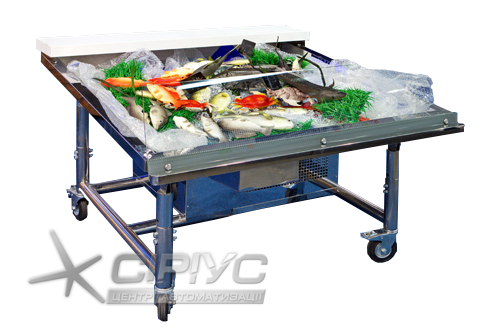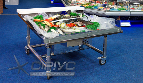 Холодильна вітрина зроблена у вигляді мобільного відкритого піддону з нержавійки, з компактним та потужним холодильним агрегатом (можлива модифікація під виносний холодильний агрегат). Висота та кут нахилу піддону — регулюються.