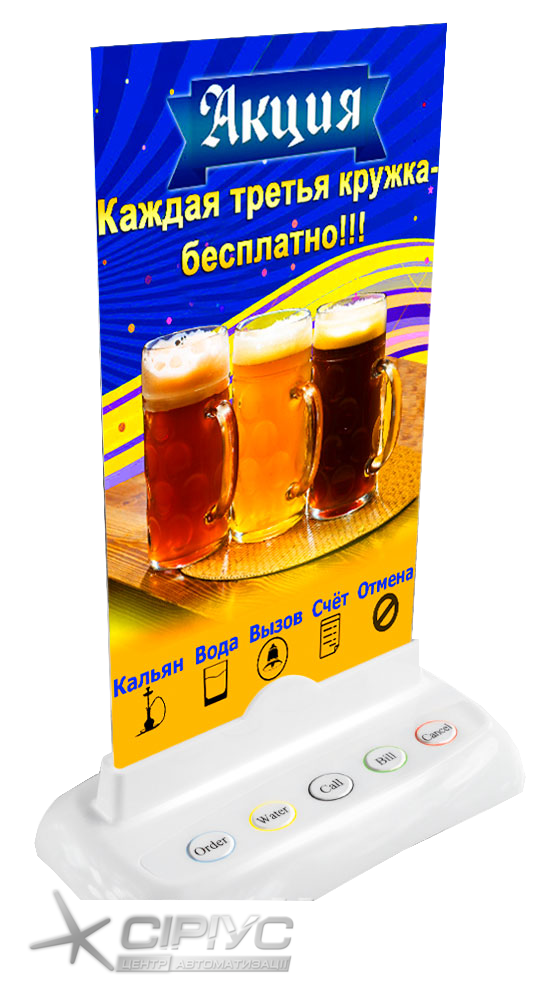 - 5 функцій: "Order" - Замовлення, "Water" - Вода, "Service"- Виклик, "Bill" - Рахунок, "Cancel" - Відміна.