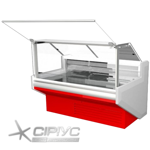 Дане обладнання виробляється з вбудованим агрегатом, фронтальним розпеченим склом. Панель управління оснащена термоконтролер Carel з функцією автоматичного відтаювання. Для більш ефективної роботи - обладнання вироблено з двома тенами, що має величезну перевагу на ряду з такими вітринами інших виробників. Демонстраційна частина і полка продавця зроблені з нержавіючої сталі. Шторки з оргскла, стаціонарна розетка - 220 В. Корпус - з фарбованого оцинкованого металу 0,65 міліметрів з пенополіуретановим заповненням.