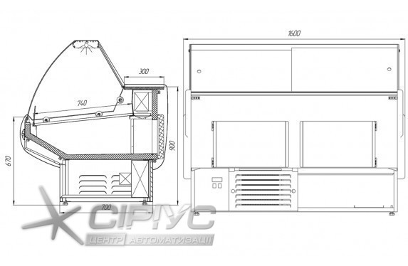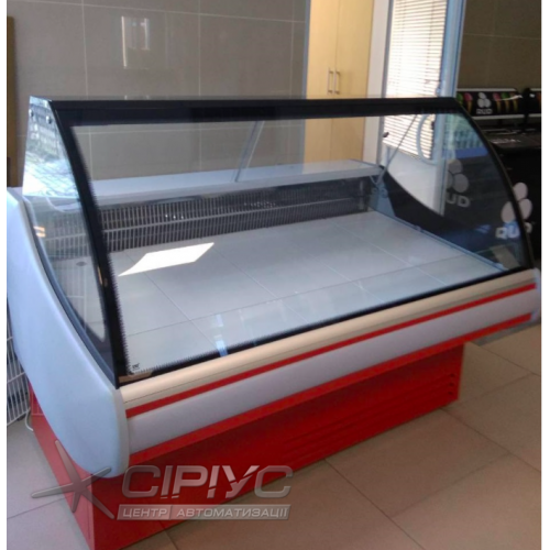Дане обладнання виробляється з вбудованим агрегатом, фронтальним гнутим розпеченим склом. Панель управління оснащена термоконтролер Carel з функцією автоматичного відтаювання. Для більш ефективної роботи - обладнання вироблено з двома тенами, що має величезну перевагу на ряду з такими вітринами інших виробників. Демонстраційна частина і полка продавця зроблені з нержавіючої сталі. Шторки з оргскла, стаціонарна розетка - 220 В. Корпус - з фарбованого оцинкованого металу 0,65 міліметрів з пенополіуретановим заповненням.