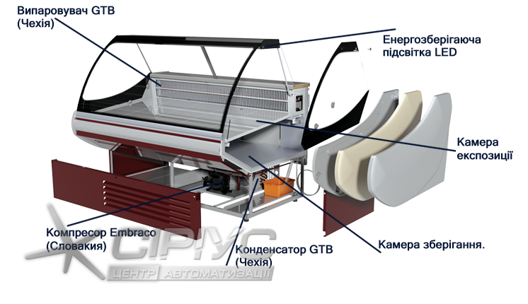 Дане обладнання виробляється з вбудованим агрегатом, фронтальним гнутим розпеченим склом. Панель управління оснащена термоконтролер Carel з функцією автоматичного відтаювання. Для більш ефективної роботи - обладнання вироблено з двома тенами, що має величезну перевагу на ряду з такими вітринами інших виробників. Демонстраційна частина і полка продавця зроблені з нержавіючої сталі. Шторки з оргскла, стаціонарна розетка - 220 В. Корпус - з фарбованого оцинкованого металу 0,65 міліметрів з пенополіуретановим заповненням.