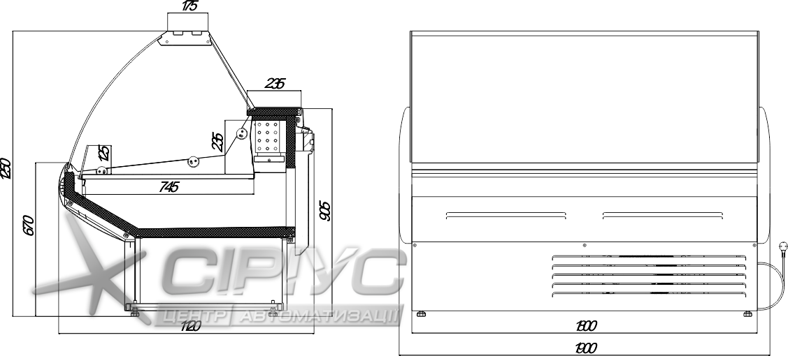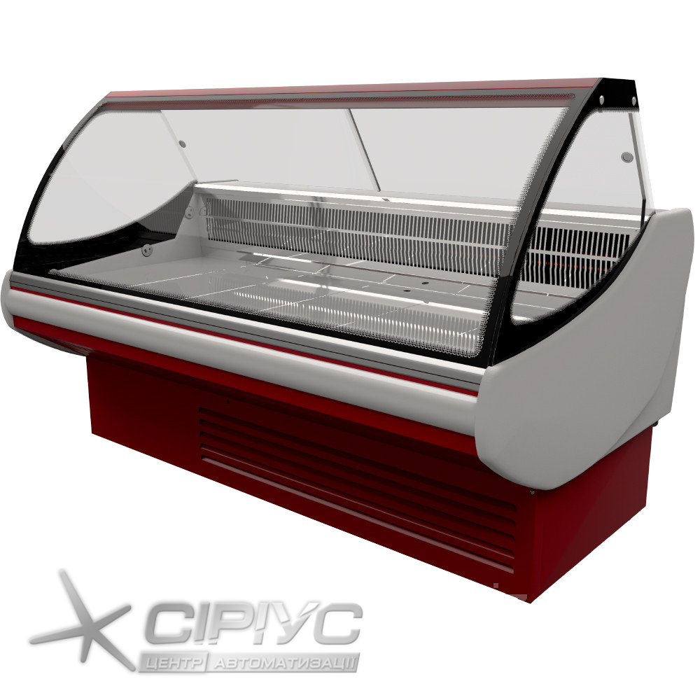 Дане обладнання виробляється з вбудованим агрегатом, фронтальним гнутим розпеченим склом. Панель управління оснащена термоконтролер Carel з функцією автоматичного відтаювання. Для більш ефективної роботи - обладнання вироблено з двома тенами, що має величезну перевагу на ряду з такими вітринами інших виробників. Демонстраційна частина і полка продавця зроблені з нержавіючої сталі. Шторки з оргскла, стаціонарна розетка - 220 В. Корпус - з фарбованого оцинкованого металу 0,65 міліметрів з пенополіуретановим заповненням.