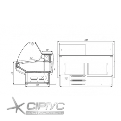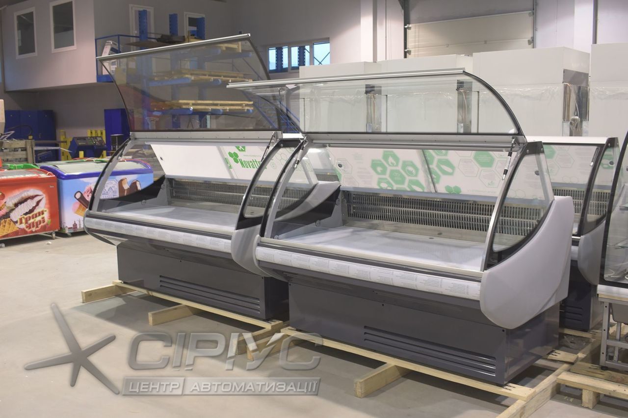 Дане обладнання виробляється з вбудованим агрегатом, фронтальним гнутим розпеченим склом. Панель управління оснащена термоконтролер Carel з функцією автоматичного відтаювання. Для більш ефективної роботи - обладнання вироблено з двома тенами, що має величезну перевагу на ряду з такими вітринами інших виробників. Демонстраційна частина і полка продавця зроблені з нержавіючої сталі. Шторки з оргскла, стаціонарна розетка - 220 В. Корпус - з фарбованого оцинкованого металу 0,65 міліметрів з пенополіуретановим заповненням.