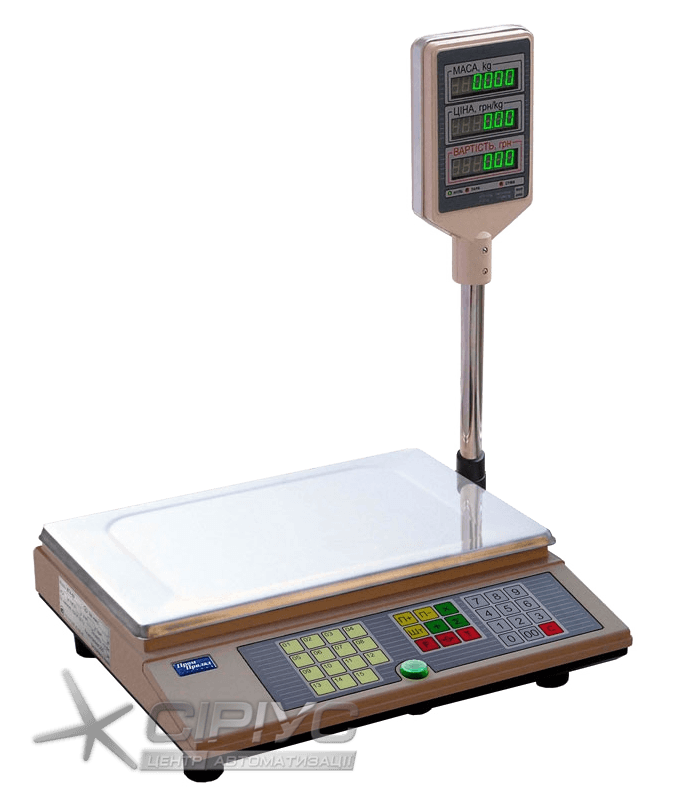 Ваги для магазинів (без акумулятора), електронні торгові. Українського виробництва ("Промприлад", Вінниця). Найбільша межа зважування — 30 кг. Трикрокова похибка: 2, 5, 10 г.